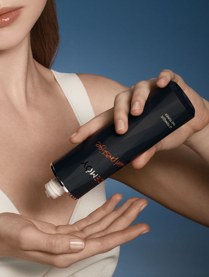 洁面后,滴取适量同系列精华水于掌心/化妆棉,轻拍/擦拭于面部,先一步润泽肌肤。